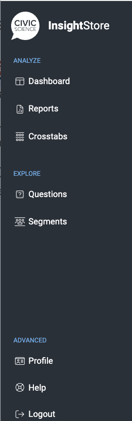 To expand the navigation pane again, use the expanding caret to the right of the CivicScience logo.